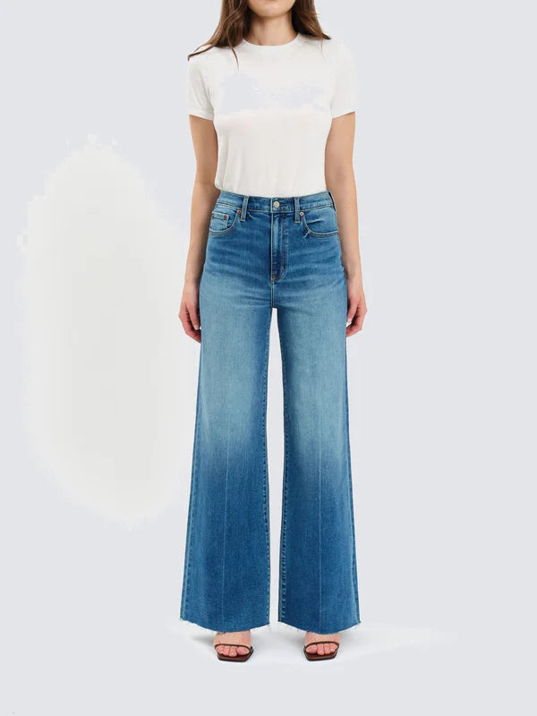 The cool girl jean, Far Out is a modern silhouette with twisted seams across the fit to give the appearance of longer legs. In a waist defining high rise, this wide leg is constructed in our "hug" denim that hugs your body, but has just enough weight to keep a structured fit.