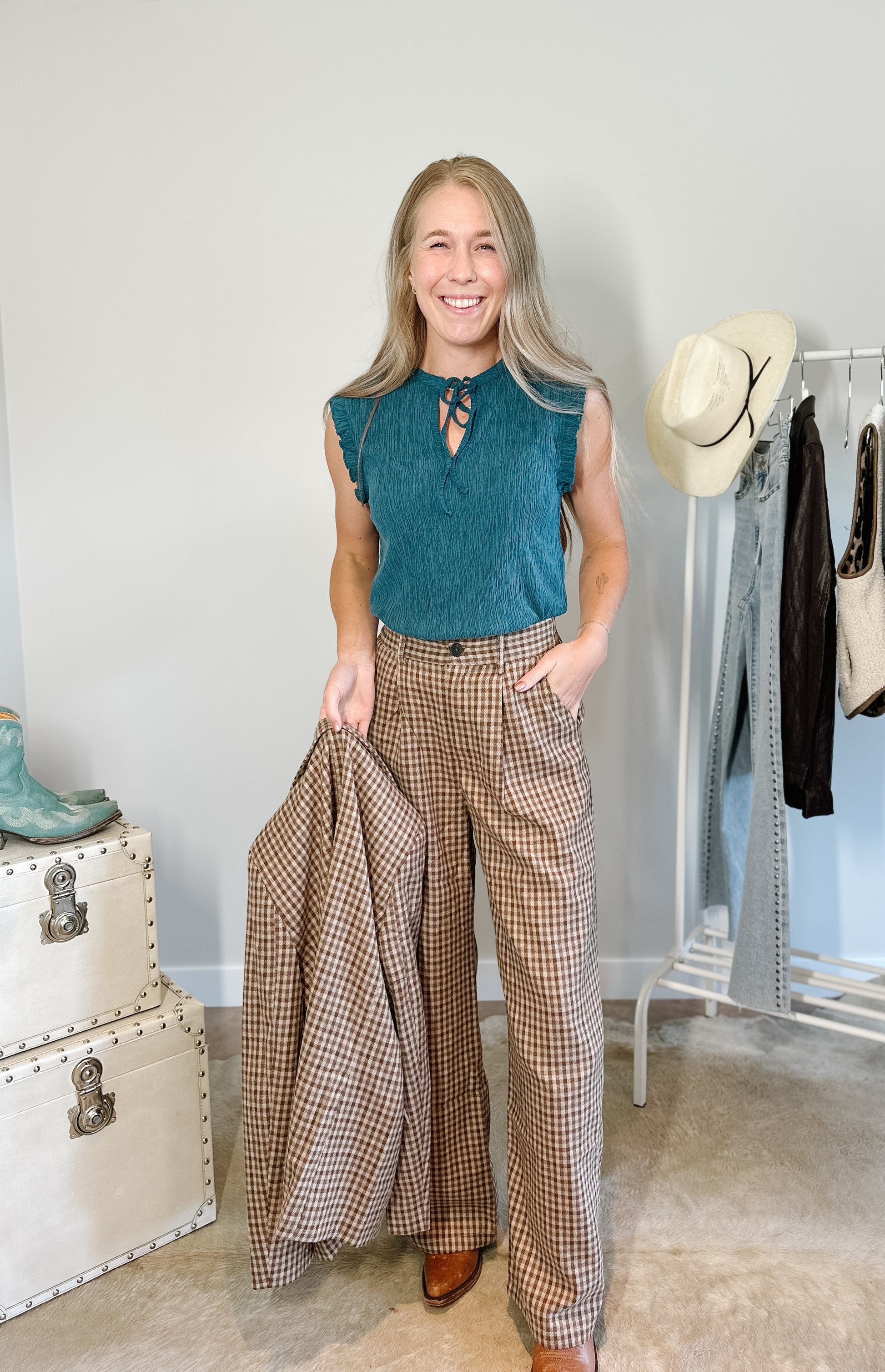 Effortless sophistication meets timeless tailoring in the On the Grid pant. Designed with a refined wide-leg silhouette and a polished gingham check, these trousers bring an elevated touch to your everyday rotation. Whether styled with a crisp blouse, cozy knit, or the matching blazer, they’re the definition of understated elegance.