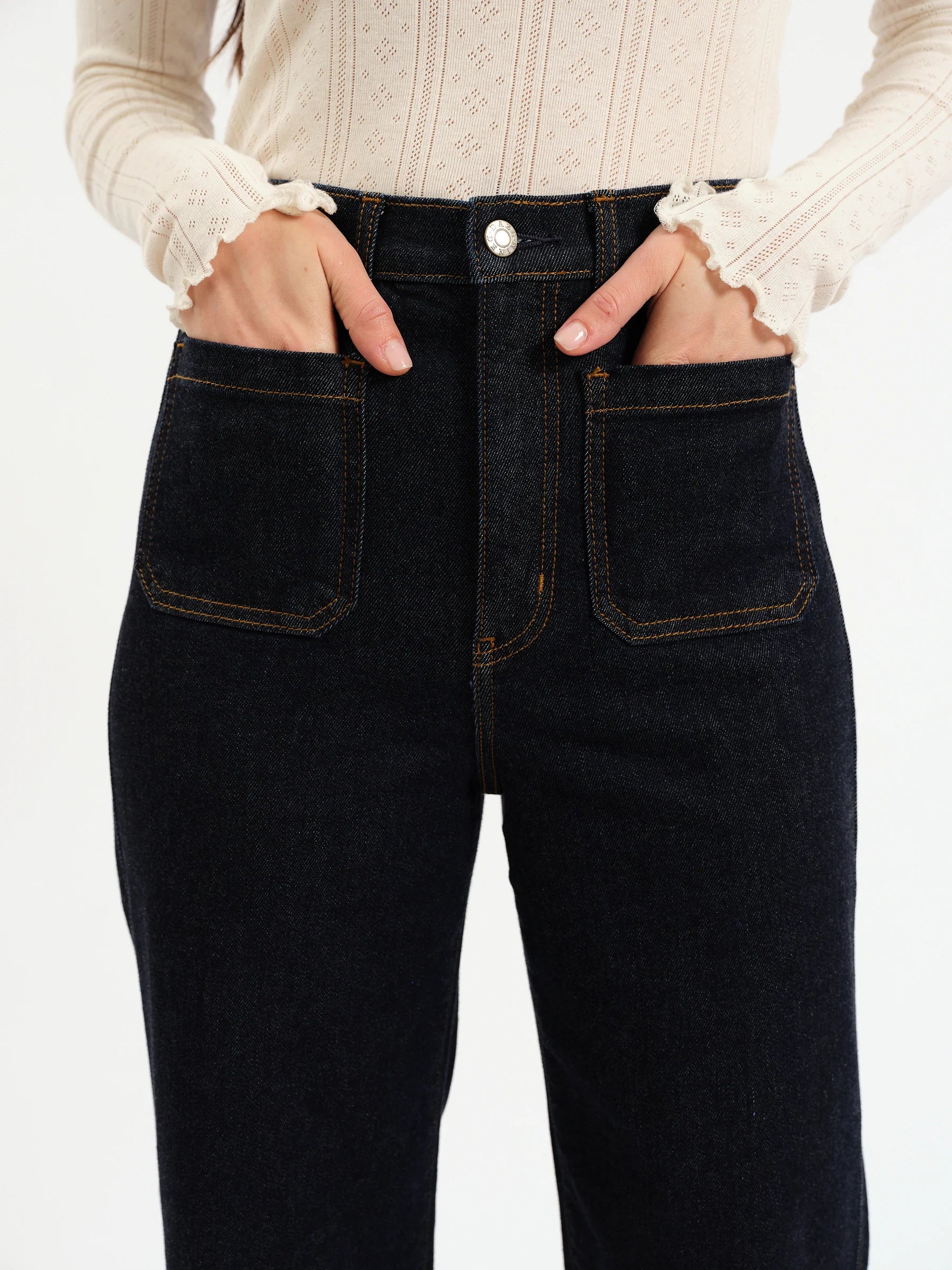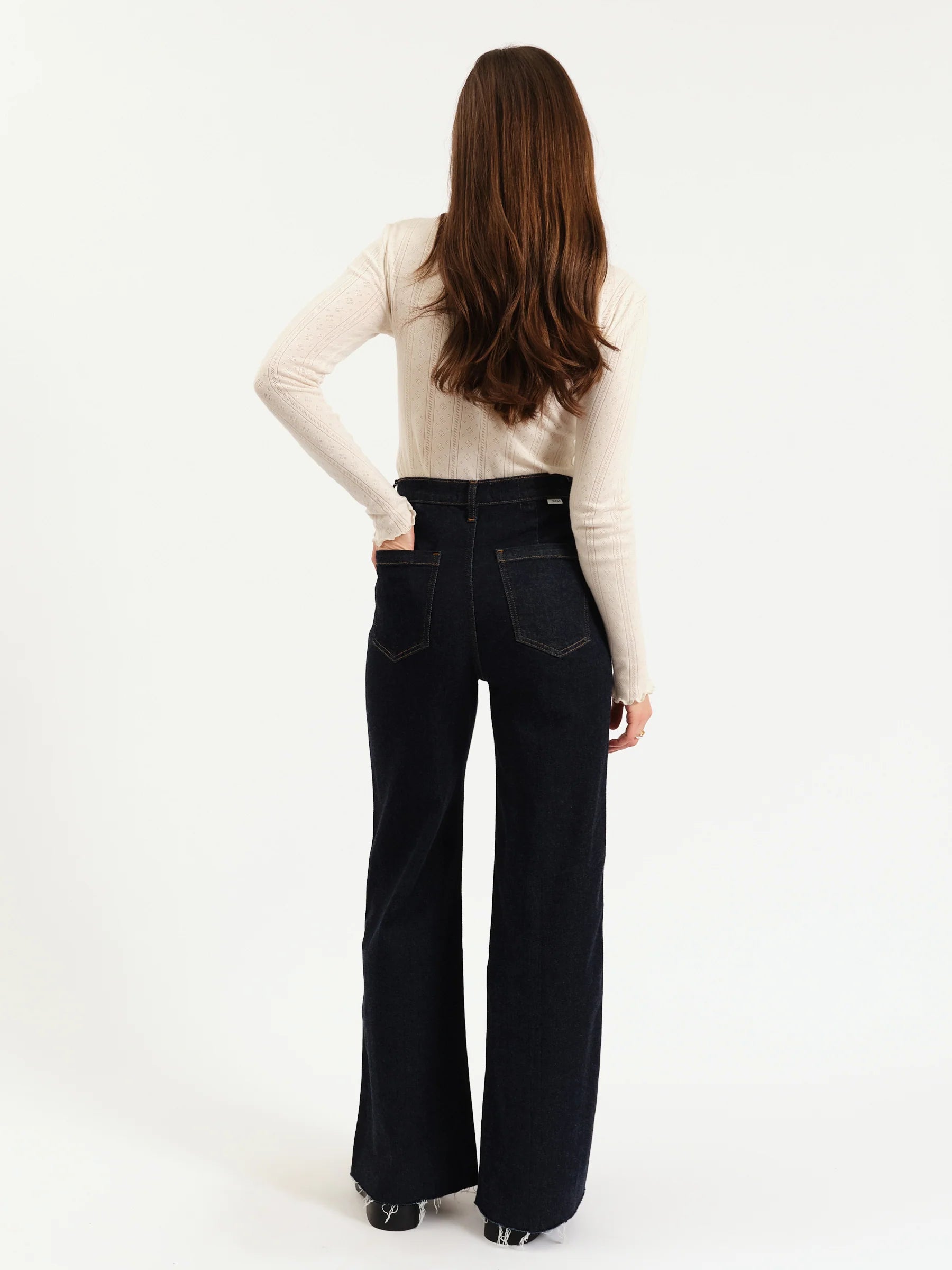 The cool girl jean, Far Out is a modern silhouette in a trending dark rinse wash with front pockets. This season's sophisticated essential, this wide leg is constructed in our comfort stretch denim.