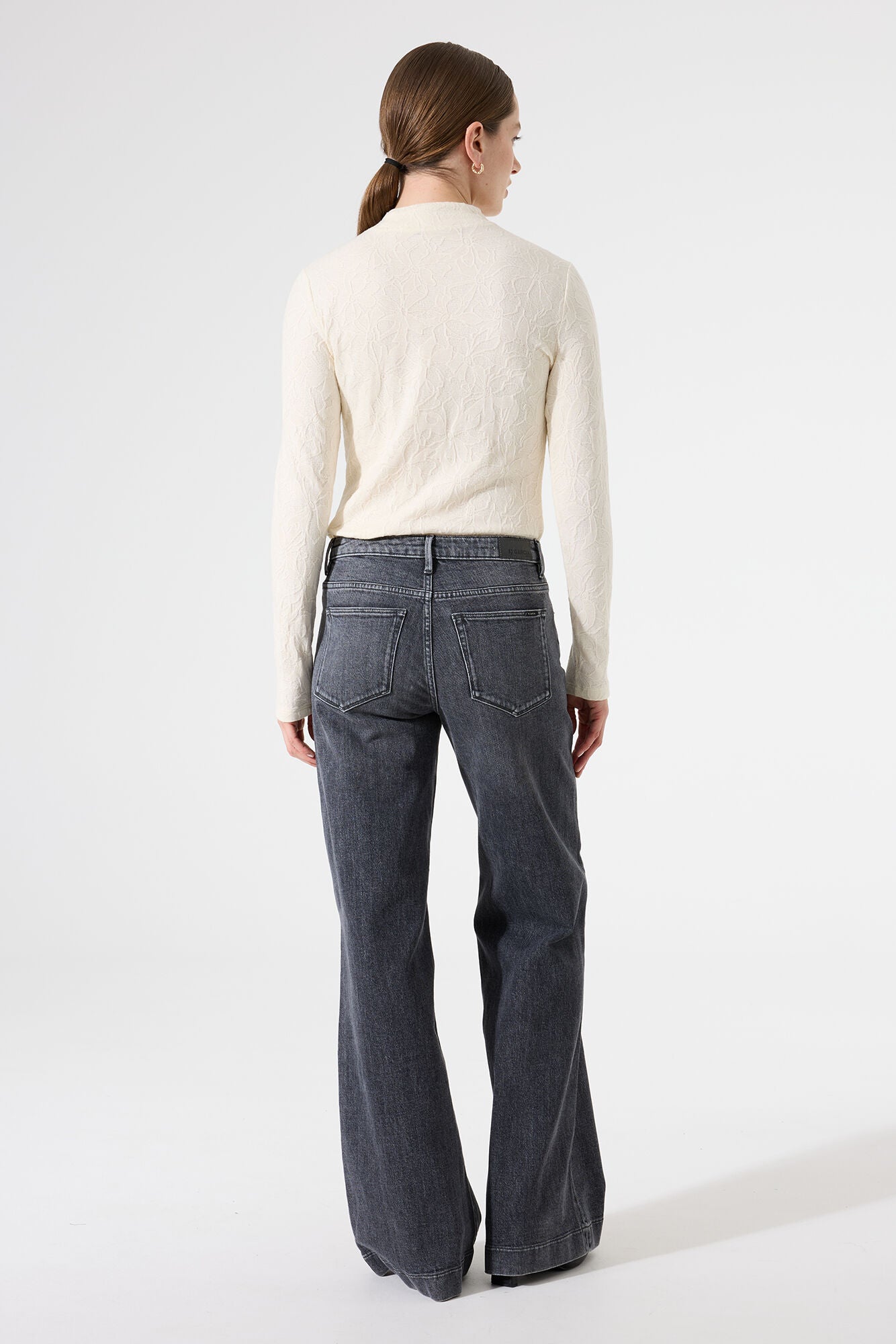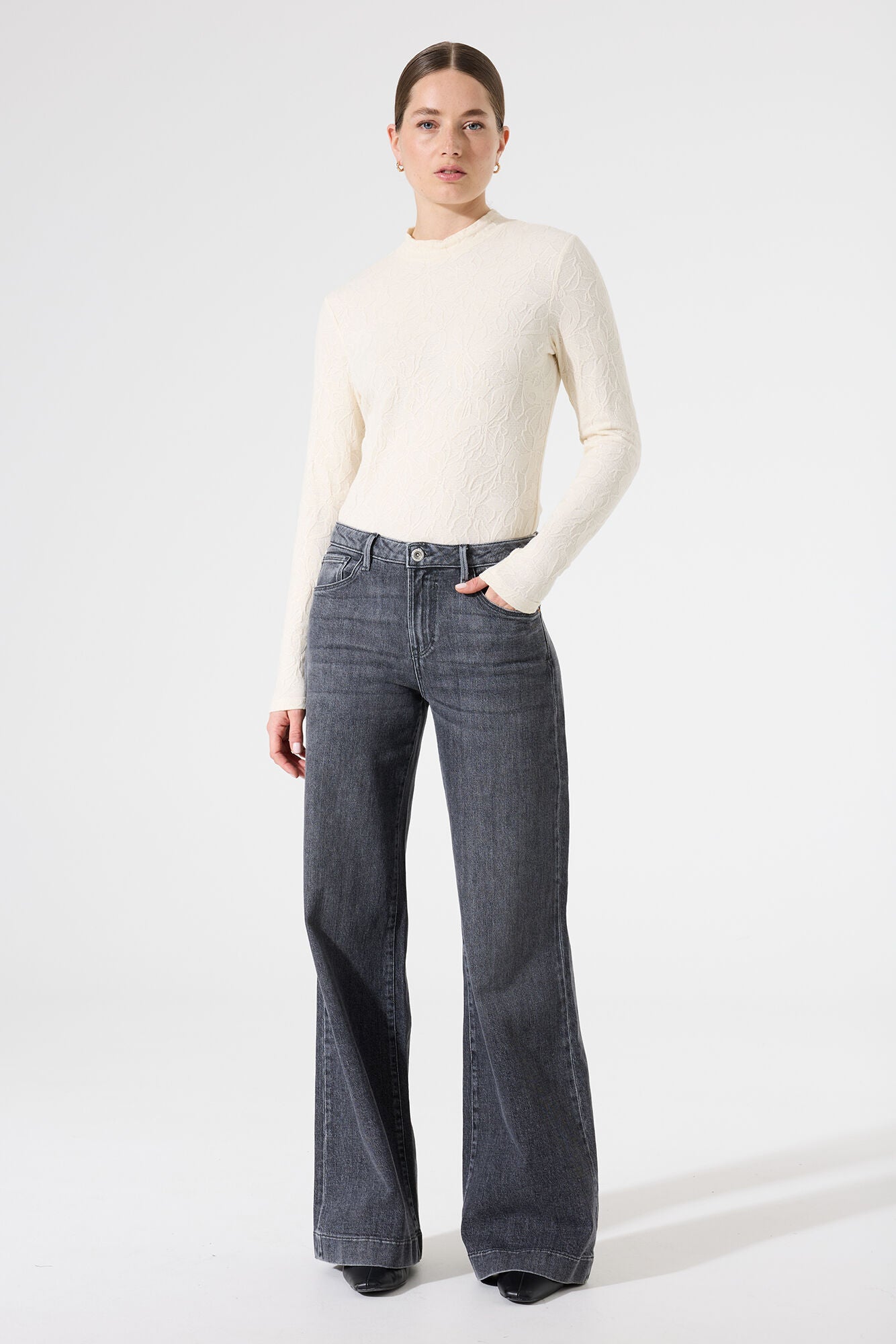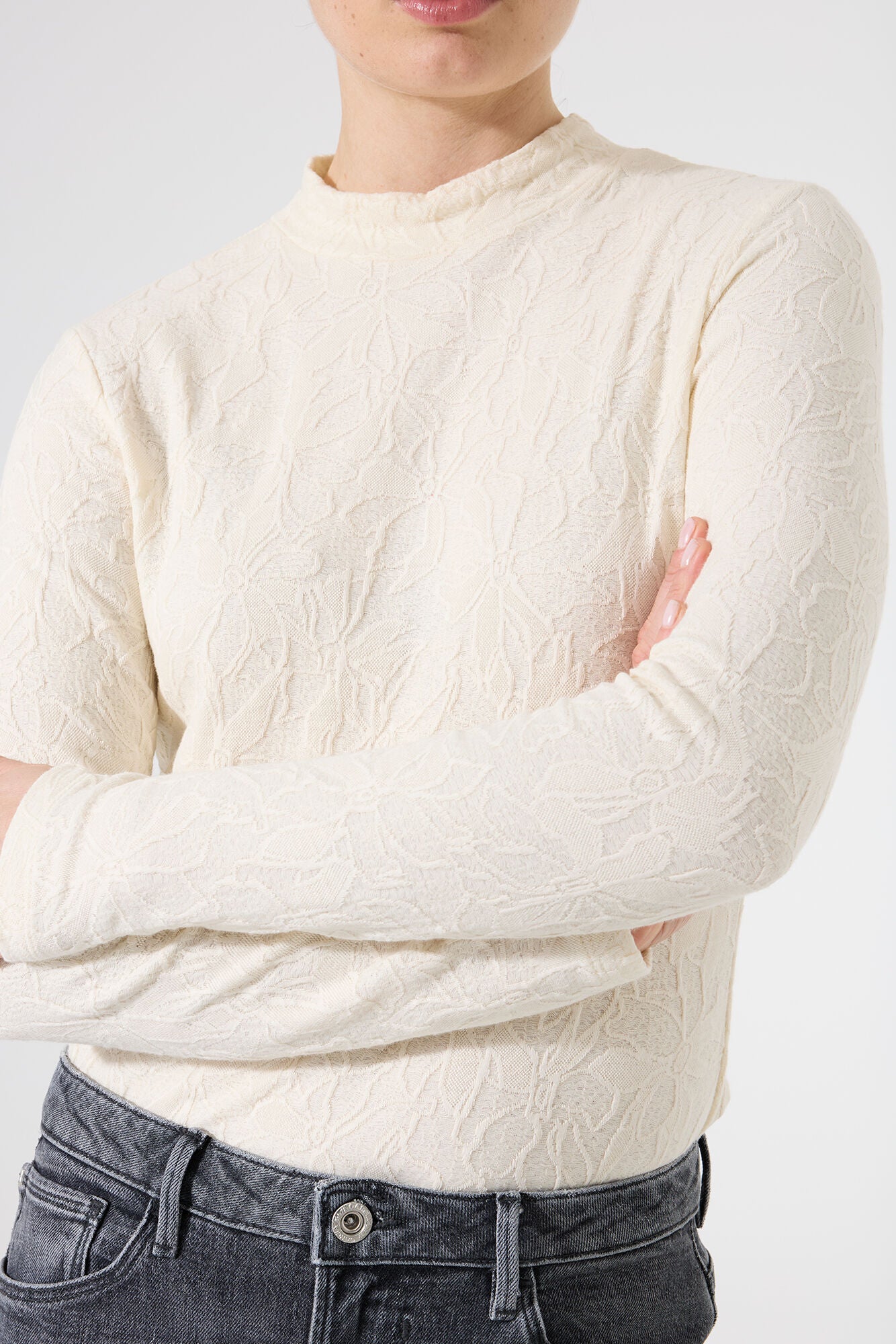 The Homestead Top is a timeless long sleeve designed for effortless layering and everyday elegance. Crafted with a subtle jacquard structure, this mock-neck top features a regular fit and long sleeves that drape beautifully, creating a refined yet comfortable silhouette.