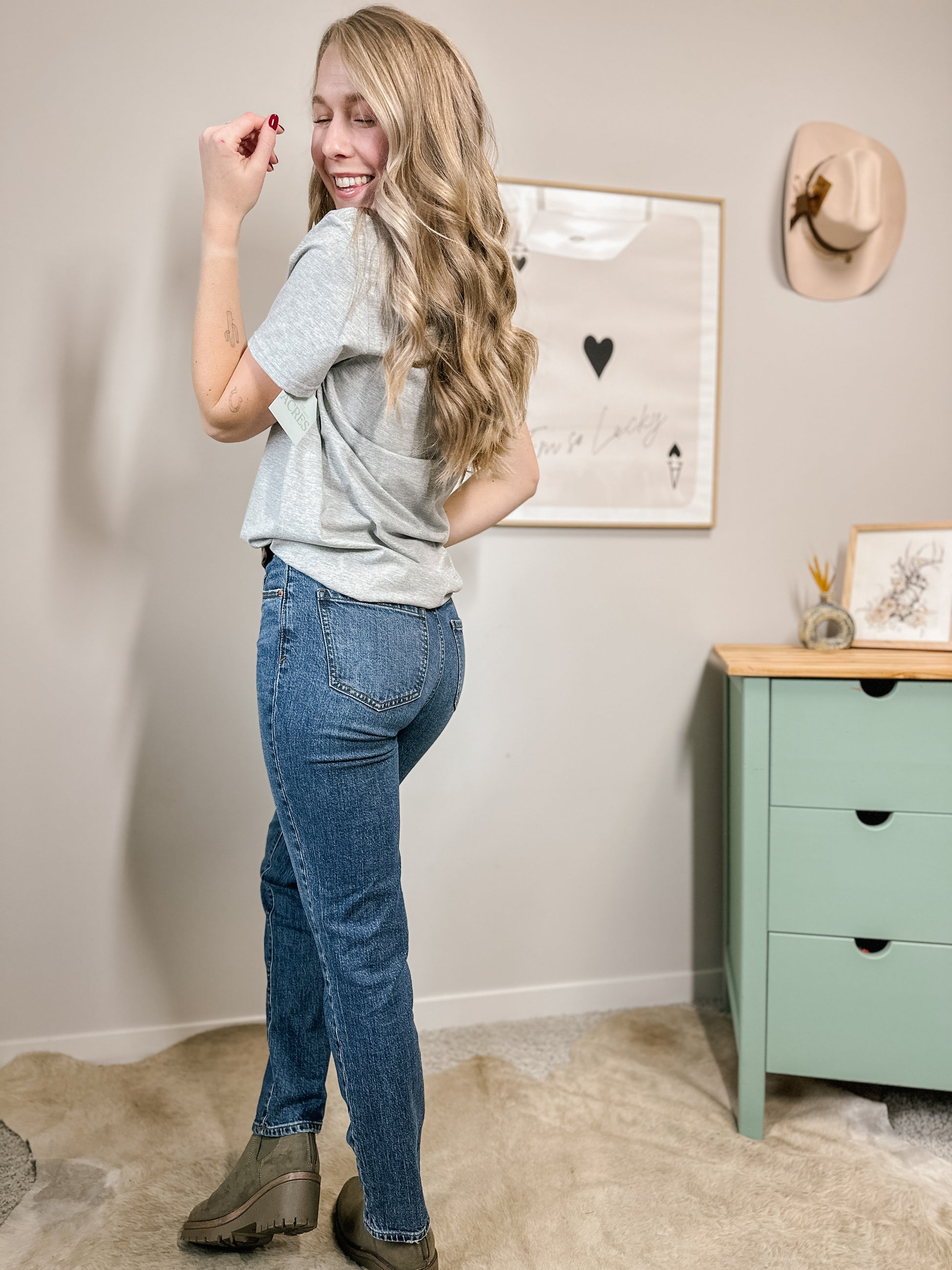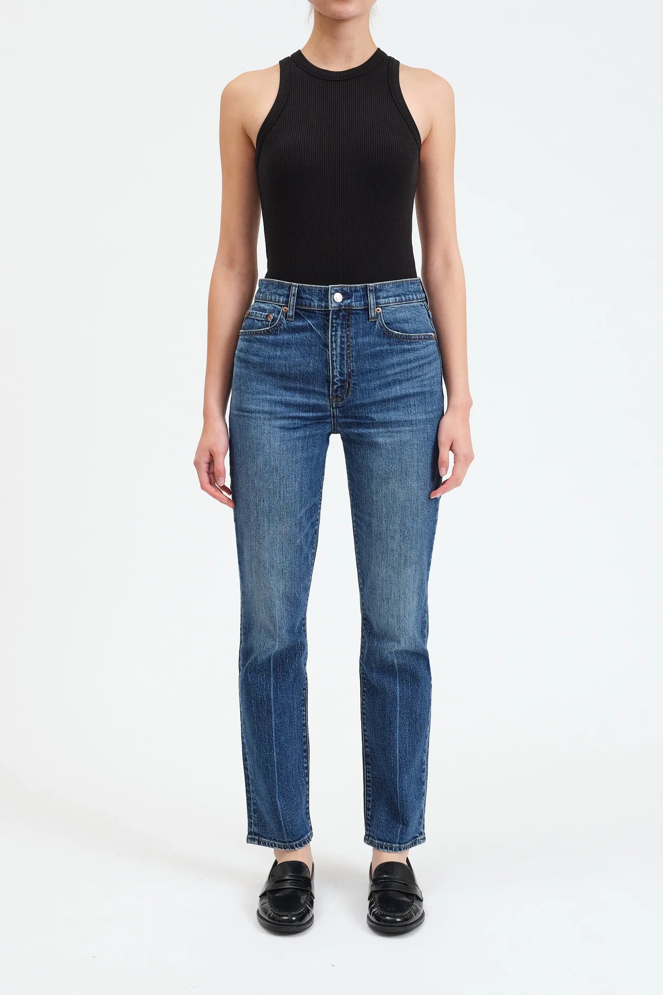 This waist defining, high rise jean is created in a faded blue jean wash to give it a true been-around-for-decades vintage look. It is crafted from our "Repreve" denim, to be a super stretch fabric created from recycled plastic.