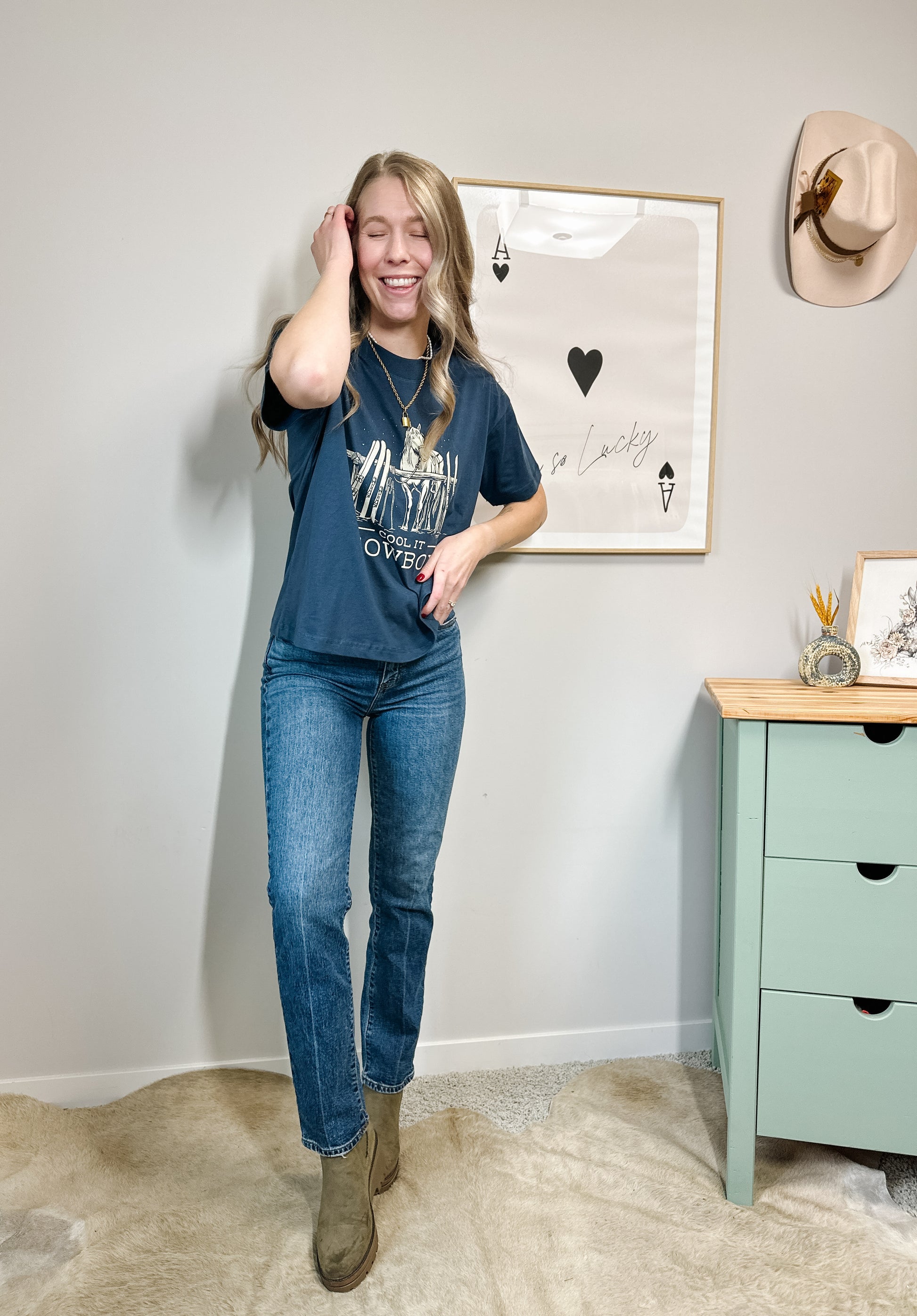 How it fits: True to size. Snug, straight leg fit. The fabric will "give" with wear. Casey-Ann is wearing a size 25 in the "Smarty" pant and usually wears a size 26 in jeans.